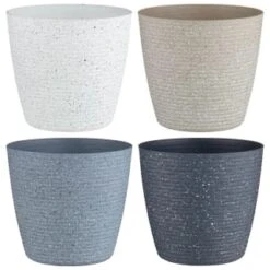 An elegant planter decorated with stylish vertical lines and elevated by three wooden legs. Ideal for real and artificial plants.